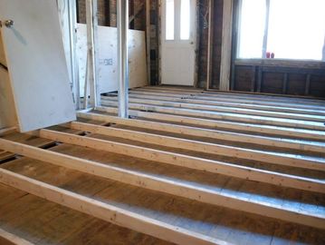 Most often, the existing subfloor is removed, and the scribes are placed right on top of the existing joists, which are then re-braced, blocked, and sheathed with new subfloor.